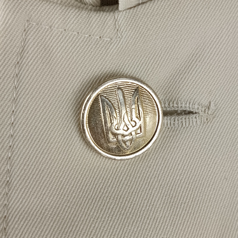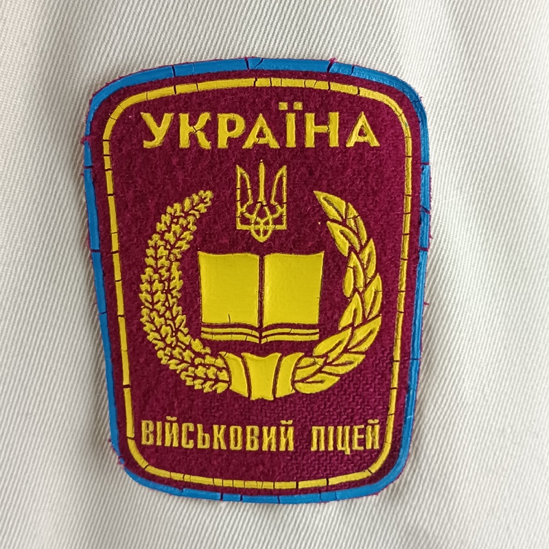 En la manga se observa parche del Liceo Militar con inscripción en cirílico “Україна” y emblema con libro y corona de laurel, distintivo de centros de formación militar. Las hombreras muestran galón metálico con letra cirílica, propio de alumnos del liceo. El pantalón a juego en el mismo tono completa el conjunto.