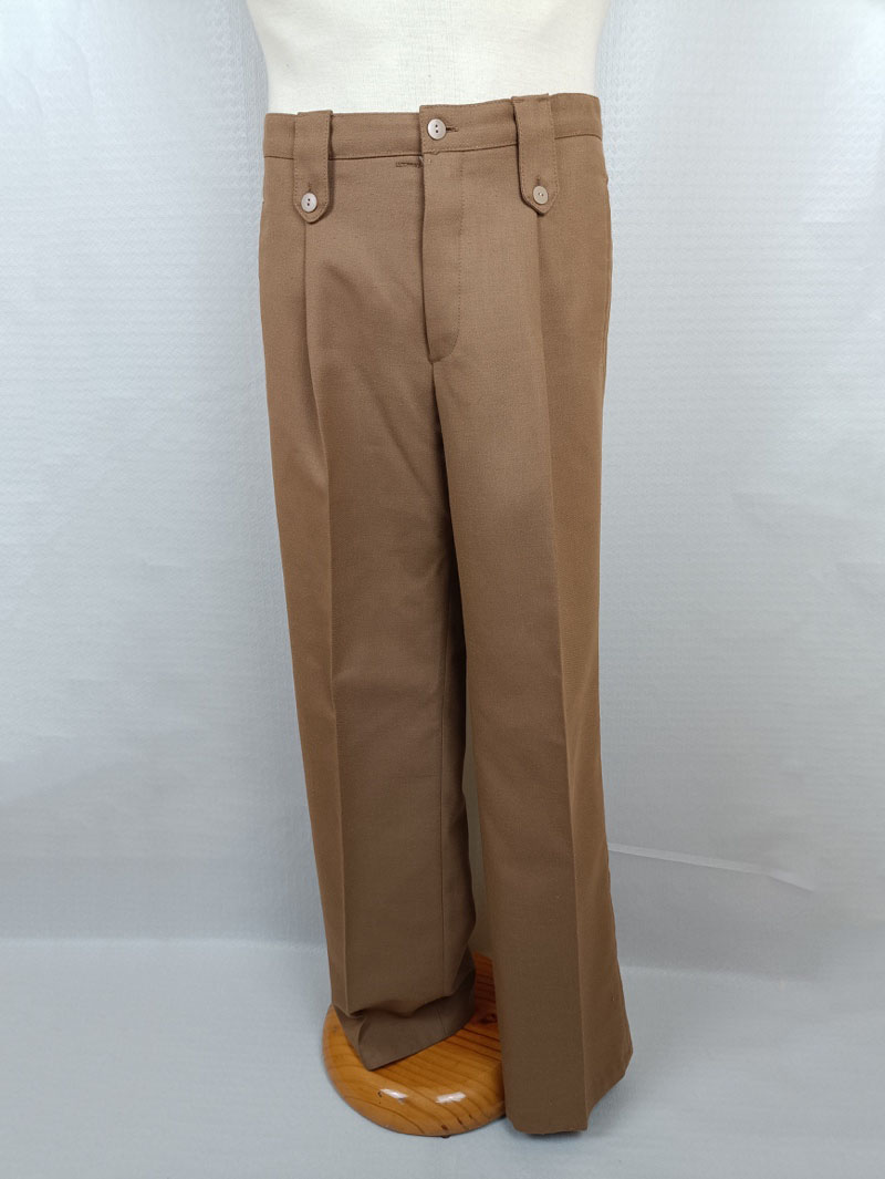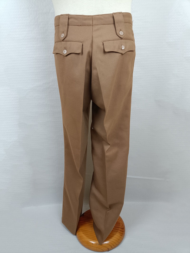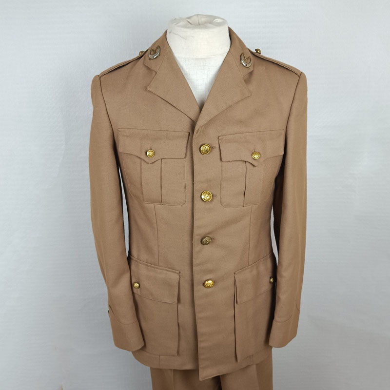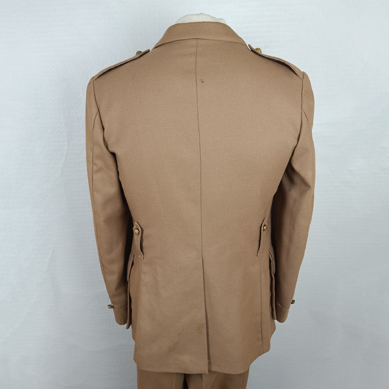 Conjunto formado por guerrera y pantalón en color caqui claro, con cuatro bolsillos frontales y botones dorados con el emblema del Ejército. Presenta distintivos metálicos de Regulares en el cuello. Etiqueta interior INDuyco S.A., fechado en 1982.