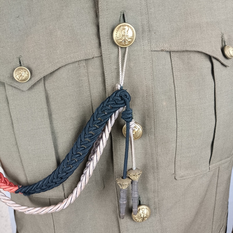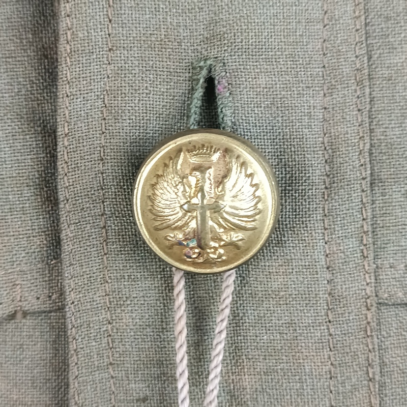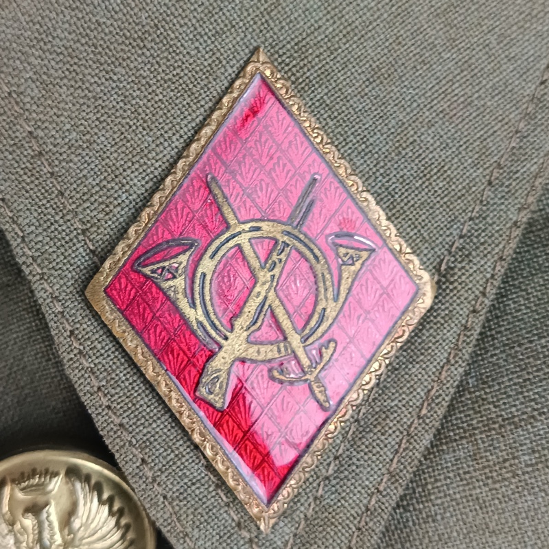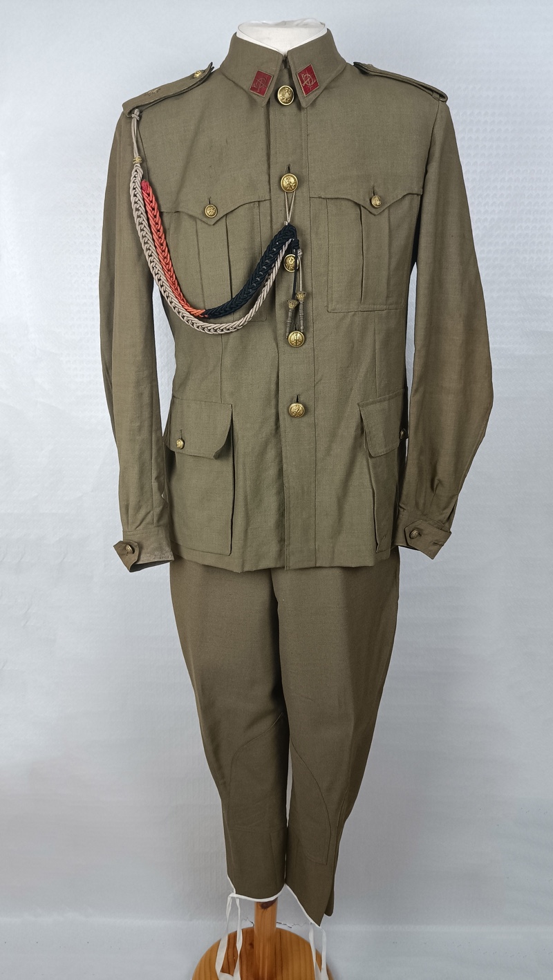 Chaqueta de cuello cerrado, Sahariana con dos bolsillos a la altura del pecho y dos en la cadera, de cierre abotonado. Rombos de infantería esmaltados de color rojo en el cuello y cordón de academia que va desde el hombro al botón de la chaqueta. Pantalón bombacho a juego, en buen estado.