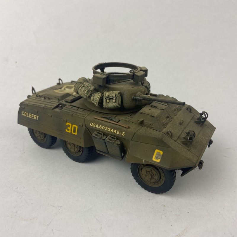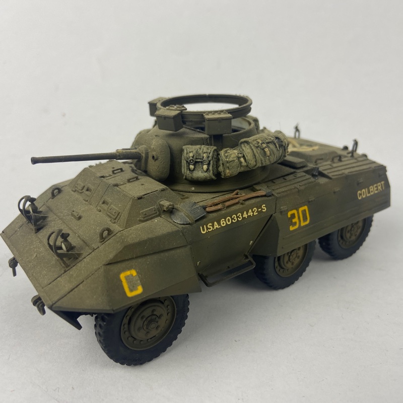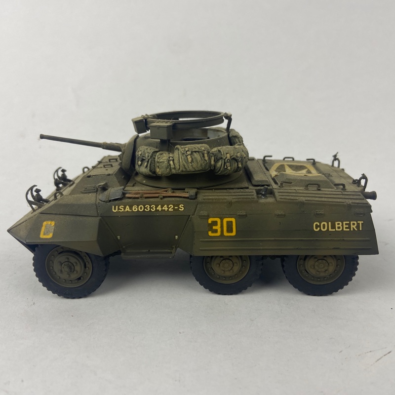 Vehículo blindado ligero M8 Greyhound del Ejército de Estados Unidos, utilizado durante la Segunda Guerra Mundial para reconocimiento, a escala 1:35. Miniatura montada y pintada a mano con marcajes tácticos y detalles realistas.
